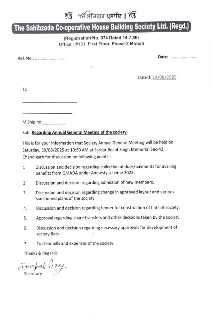 Other conditions as per NIT, which shall be available in Society office H.No.131, First Floor, Ph-2, Mohali-160055. (Mob. No. 9815225522).