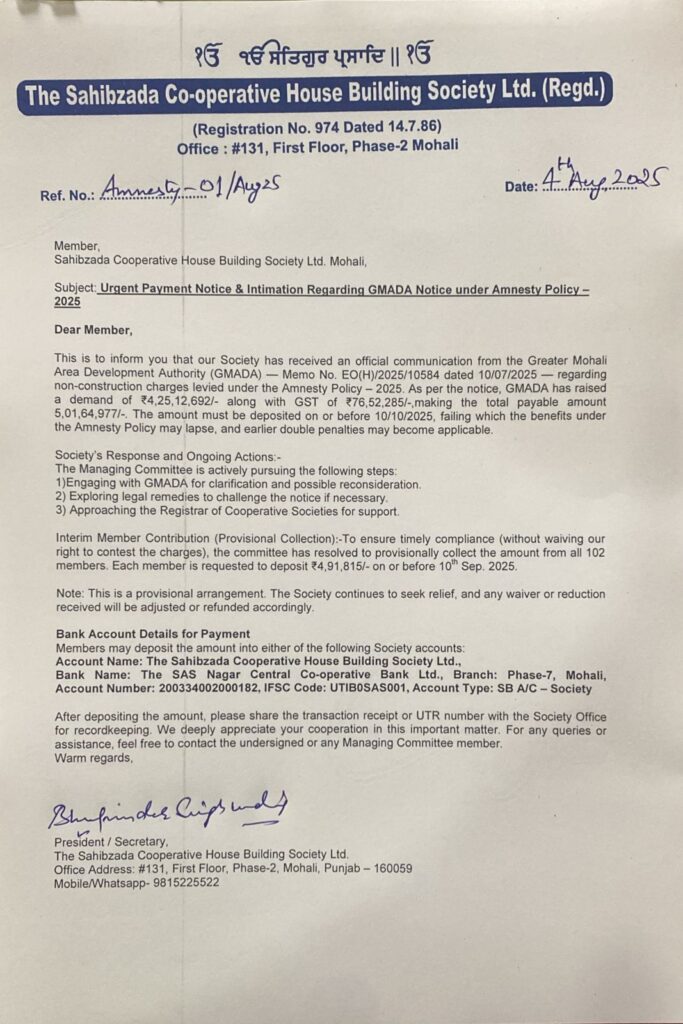 Urgent Payment Notice & Intimation Regarding GMADA Notice under Amnesty Policy – 2025